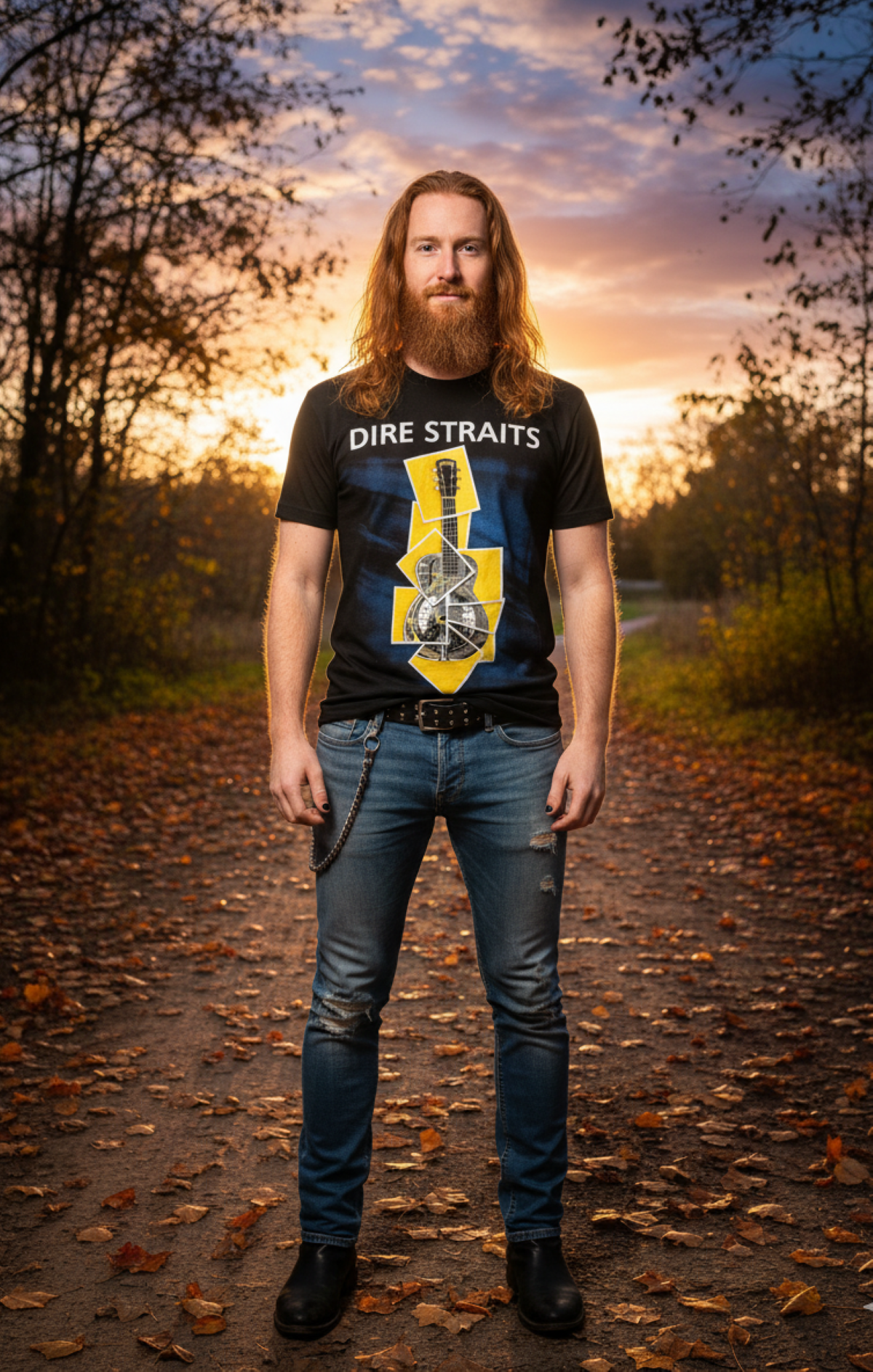 Camiseta Dire Straits 100% Algodão. Malha: Penteada Fio 30.1 / 100% algodão. Estampa: Silk-screen de alta qualidade, estampa na frente e nas costas.Gola: Preta com elastano, reforço interno ombro a ombro, modelo careca/redonda. Etiqueta: Possui etiqueta interna do fabricante com CNPJ. Tipo de Manga: Manga Curta.