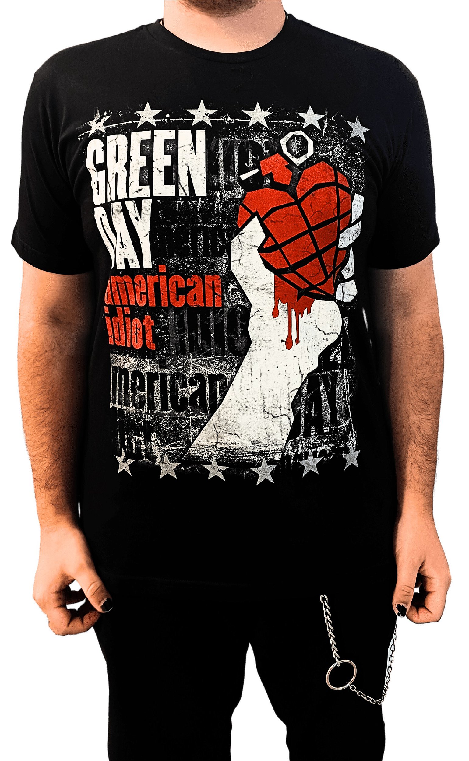 Camiseta Green Day 100% Algodão. Malha: Penteada Fio 30.1 / 100% algodão. Estampa: Silk-screen de alta qualidade, estampa na frente e nas costas.Gola: Preta com elastano, reforço interno ombro a ombro, modelo careca/redonda. Etiqueta: Possui etiqueta interna do fabricante com CNPJ. Tipo de Manga: Manga Curta.